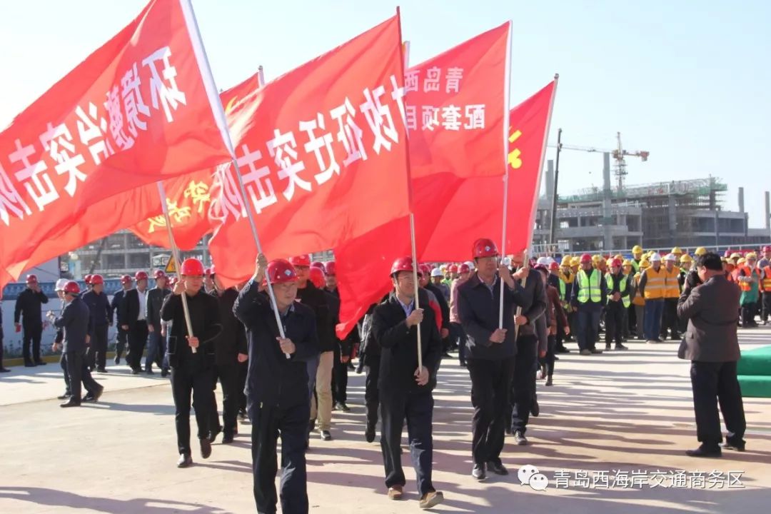 為深入貫徹落實(shí)新區(qū)工委、管委“突擊50天,決勝西客站”的部署,全面做好青島西站建成倒計(jì)50天的突擊工作,實(shí)現(xiàn)青島西站2018年12月20日開通運(yùn)營的目標(biāo),10月29日,交通商務(wù)區(qū)在青島西站施工現(xiàn)場舉行了“突擊50天,決勝西客站”誓師大會(huì)。西海岸新區(qū)管委主任、區(qū)長李奉利,區(qū)委常委、副區(qū)長解宏勁,副區(qū)長、黨組成員顧清彌、區(qū)政府黨組成員劉記軍、區(qū)政府黨組成員劉元玉以及各相關(guān)部門、街道和全體參建單位參加了誓師大會(huì)。